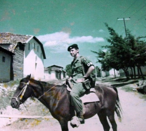 Looking a lot like Cervantes’ Don Quixote Gerald Kelly, a Green Beret officer working for the Organization of American States in 1969 during the “Soccer War” between Honduras and El Salvador, keeps the peace atop his steed. Photo provided