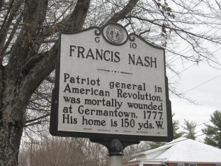 Francis Nash (c. 1742 – October 7, 1777) was a brigadier general in the Continental Army during the American Revolutionary War. As a lawyer and public official in Hillsborough, North Carolina, he opposed the Regulator Movement, an uprising of settlers in the North Carolina Piedmont between 1765 and 1771. He represented Hillsborough in the General Assembly of colonial North Carolina, and was a delegate to the colony's first three Patriot provincial congresses. In 1775, he was named lieutenant colonel of the 1st North Carolina Regiment under Colonel James Moore. He was made a brigadier general in 1777 upon Moore's death, and given command of the North Carolina brigade of the Continental Army under General George Washington. He was wounded at the Battle of Germantown on October 4, 1777, and died several days later. Nash was one of ten Patriot generals to die from wounds received in combat between 1775 and 1781. He is honored by several city and county names, including Nashville, Tennessee.