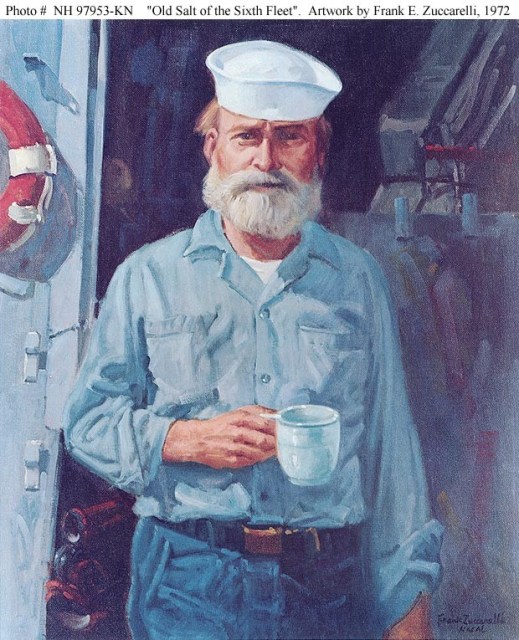 Old Salt of the Sixth Fleet Letterpress reproduction of an oil painting by Frank E. Zuccarelli, depicting a Salty Sailor on board USS Strong (DD-758), while on duty with Sixth Fleet in the Mediterranean Sea, July 1972. Courtesy of the Navy Art Collection, Washington, D.C. U.S. Naval History and Heritage Command Photograph. Catalog #: NH 97953-KN
