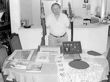 Harry Allcroft of Port Charlotte, Fla. holds a Japanese carbine and a Samurai sword he “liberated” from some of the contraband found aboard the Japanese hospital ship Tachibana Maru. Sun photo by Don Moore