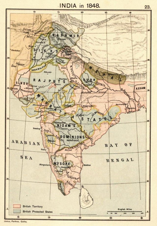 This map of India in 1848 shows the political geography at the time of the Anglo-Sikh Wars. The Sikh kingdom is in the upper left, the northwest portion of the subcontinent. Below is a map…