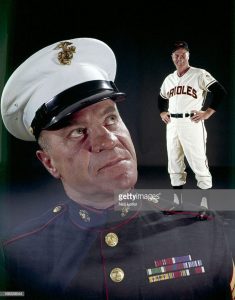 Baltimore Orioles manager Hank Bauer (42) in USMC uniform, viewing himself in team uniform over his shoulder during photo shoot. Composite. Bauer earned 11 campaign ribbons, two Bronze Stars and two Purple Hearts during his time with the Marines.