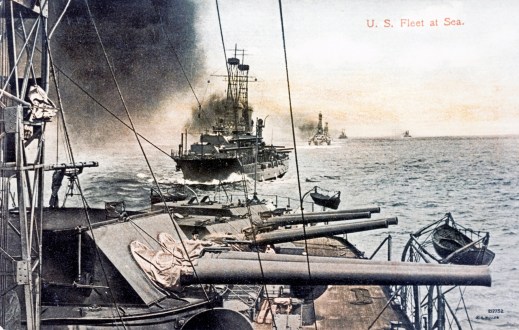 Here we see, on the cusp of the Great War, a most excellent color-tinted postcard published by the Valentine Souvenir Co., New York from a photograph by Enrique Muller, showing brand-new early dreadnoughts of the U.S. Atlantic Fleet steaming in line ahead, circa summer, 1914.