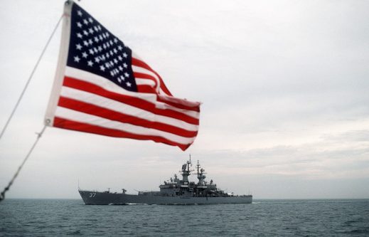 “The American flag flies from a vessel in the foreground as the nuclear-powered guided missile cruiser USS South Carolina (CGN-37) returns to port from deployment in the Persian Gulf area during Operation Desert Storm, 28 March 1991.”