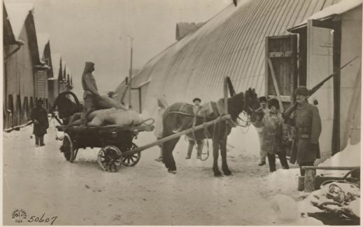 Guard at the doorway of this warehouse of food supplies for the Allied troops campaigning south of Archangel in 1919 is an American of the 339th, note his distinctive M91, with its lengthy spike bayonet affixed. 111-SC-50607