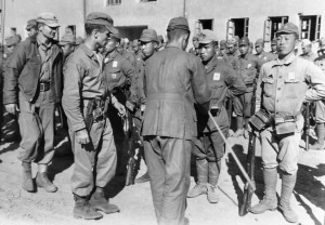 American officers of the 6th Marine Division inspect Japanese soldiers at Tsingtao airfield. As Japanese soldiers were repatriated from China after World War II ended, some remained to guard rail lines against sabotage or disruption caused by the reemergence of civil war in China.