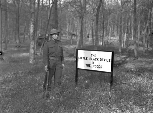 Rifleman F.C.S. Lloyd of The Royal Winnipeg Rifles standing beside the regiment’s sign, “The Little Black Devils in the Woods,” in the dark forest of the Klever Reichswald, 19 March 1945.