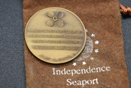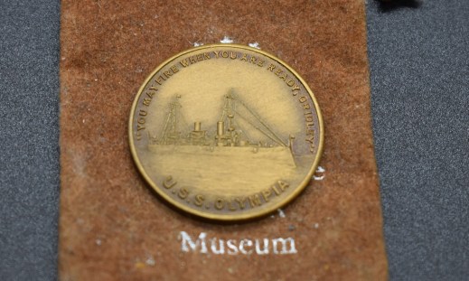 The Cruiser Olympia Association long ago used one of the screws, which were removed when Olympia passed into use as a museum ship in 1957, for a series of commemorative coins that helped to fund the group’s operations. The 32mm bronze coins were issued for the 60th anniversary of the battle in 1958, although the Museum still had a number left in their gift shop when I visited in 2013.