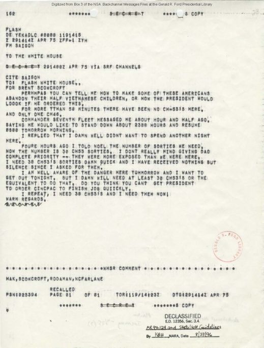 29 April 1975: As NVA tanks were moving into the city, the U.S. Ambassador to the Republic of Vietnam, Graham Martin, sent the below telegram to National Security Adviser Brent Scowcroft, at the White House, during the evacuation of Saigon during the Vietnam War.