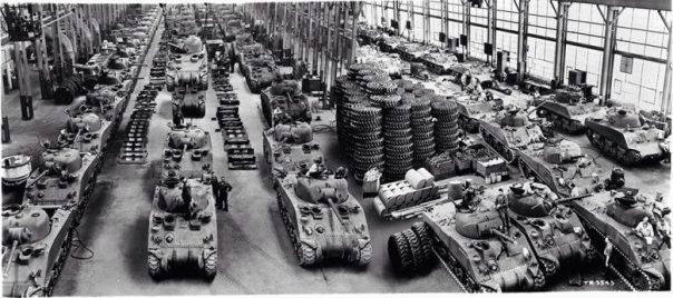 In late 1940 for the United States to serve as the “arsenal of democracy,” American industry had stepped up to meet the challenge. U.S. factories built to mass-produce automobiles had retooled to churn out airplanes, engines, guns and other supplies at unprecedented rates. At the peak of its war effort, in late 1943 and early 1944, the United States was manufacturing almost as many munitions as all of its allies and enemies combined.