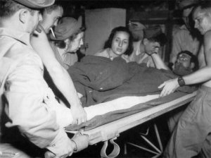 Buna casualty arrives at the 171st Station Hospital, at Port Moresby, Papua, Dec 42. This 500-bed Hospital arrived at Port Moresby early December and operated together with the 153d Sta Hosp, the 10th Evac Hosp, and a provisional Battalion of the 135th Med Regt. Because of malaria, those patients who, after treatment, were expected to remain unfit for duty more than 14 days, were usually sent to mainland Australia (Townsville or Brisbane).