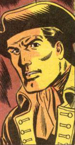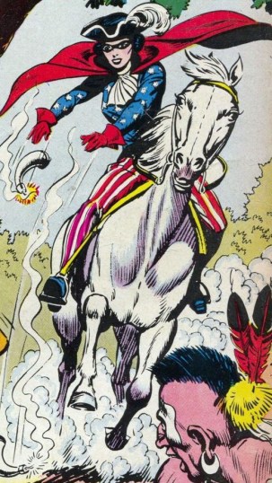 During this Golden Age of comics, few heroes had their stories set during the Revolution itself. (Perhaps because the Colonies lacked the chemical laboratories and sci-fi inventions that tend to spawn superpowers.) The exception was Tomahawk, who first appeared in Star Spangled Comics#69 in 1947. A buckskin-clad frontiersman, Tom Hawk became one of George Washington’s most capable operatives, and led a band of rangers. Tomahawk enjoyed a long run of stories stretching until 1972, which introduced two generations of readers to the Revolution’s frontier warfare. Most of Tomahawk’s adventures were illustrated by Frederic “Fred” Ray, who brought historical accuracy to the work. (During his career Ray also documented Civil War uniforms and published books about Fort Ticonderoga and the Alamo.[12])