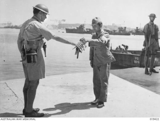 “Token of surrender. Commander Yuzo Tanno hands over the keys of Yokosuka Naval Base to Captain H. J. Buchanan, Royal Australian Navy. Buchanan led the first British Commonwealth party to go ashore in Japan.”