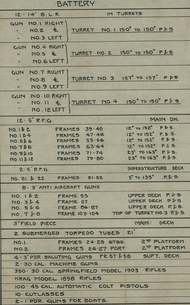 From the 1924 overhaul plans of the Pennsylvania-class dreadnought USS Arizona (BB-39), listing her battery. Besides the traditional battlewagon muscle such as 14″/45, 5″/51, and 3″/50 guns, keep scrolling down passed the two submerged torpedo tubes, two 1-pounder boat guns, and quartet of four-pounder saluting guns, and you see her impressive small arms locker for fielding a light battalion-sized landing force of bluejackets armed with 350 M1903 Springfields, 100 GI .45s, an unspecified number of Krag 1898s (which may have been line throwers), two .30-cal machine guns, and a 3-inch field piece.