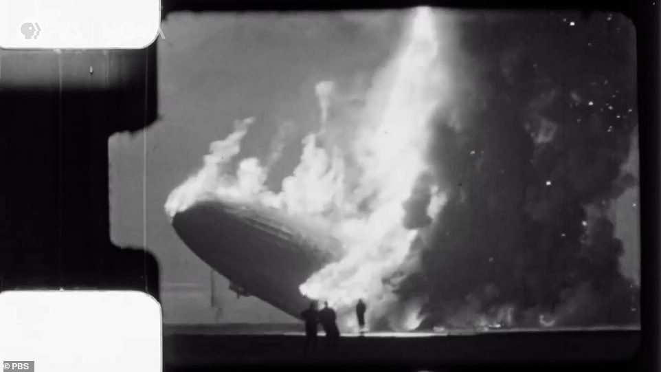 Existing newsreel footage shows a close-up view of the airship as it burned while falling from the sky.