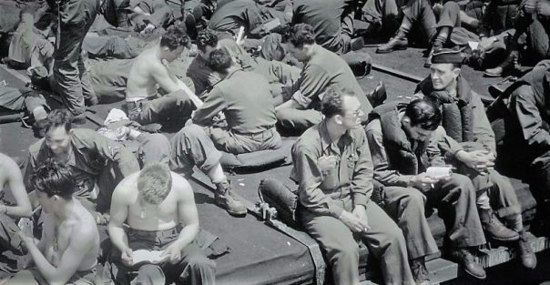 As they boarded, the ship’s crew immediately began enforcing the security procedures. All portholes and hatches were covered and no lights were allowed after dusk. The heat below deck would become intolerable. The arrival of the “ditty bags” filled with toiletries, cigarettes, gum and a harmonica brightened…