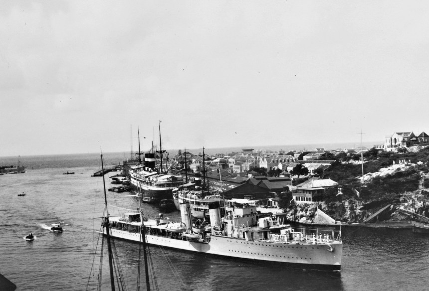 Here we see the Improved A-class/River-class destroyer, HMCS Saguenay (H01/D79/I79) entering Willemstad Harbor, Netherlands Antilles, during her 1934 cruise. The Royal Canadian Navy’s first “new” warship, she would lose large portions of herself on two different occasions during WWII but prove to be one very tough tin can.