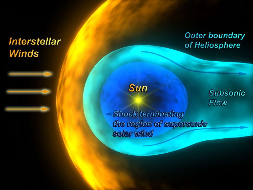 In plasma physics, the Heliosphere is a vast cavity formed by the Sun, a “bubble” continuously “inflated” by plasma originating from that body known as “solar wind’ and separating our own solar system, from the vastness of interstellar space. The outermost reach of the Heliosphere comprises three major sections called the Termination Shock, the Heliosheath, and the Heliopause, so called because solar winds and interstellar winds meet to form, a zone of equilibrium.