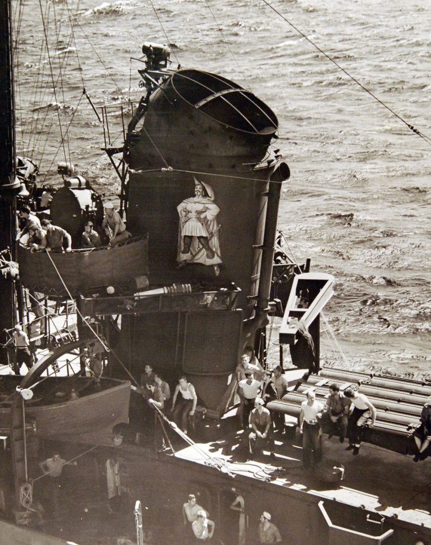 An early Fletcher-class destroyer named after RADM Isaac C. Kidd, who perished on the bridge of USS Arizona on December 7th, the “Pirate of the Pacific” earned 12 battlestars in WWII then continued her service in the Korean conflict and the Cold War. Her buccaneer moniker came from a giant figure of the famed privateer captain on her stack. Destroyer nose art, if you will.