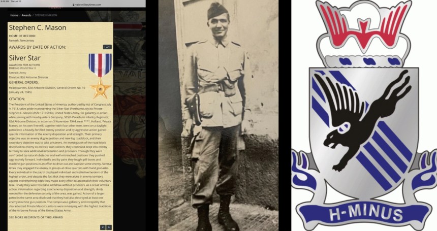 Mason, assigned to Headquarters Co., 505th Parachute Infantry Regiment, 82nd (“All American”) Airborne Division, was reported missing in action during the famed “Bridge too far” that was Operation Market Garden after his patrol failed to return from a mission “into a heavily-fortified enemy position and by aggressive action gained specific information of the enemy disposition and strength” near Beek, Netherlands on 3 November 1944. His body was unable to be recovered. Mason posthumously received the Silver Star for his actions.