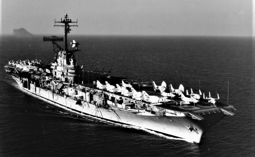 Here we see the modified Essex-class attack carrier USS Shangri-La (CVA-38) off Gibraltar, 13 October 1963– 58 years ago today and the traditional birthday of the U.S. Navy, as a matter of fact. Just as the fabled rock holds a key place in British history, “Shang” holds a singular role in American naval history and lore.