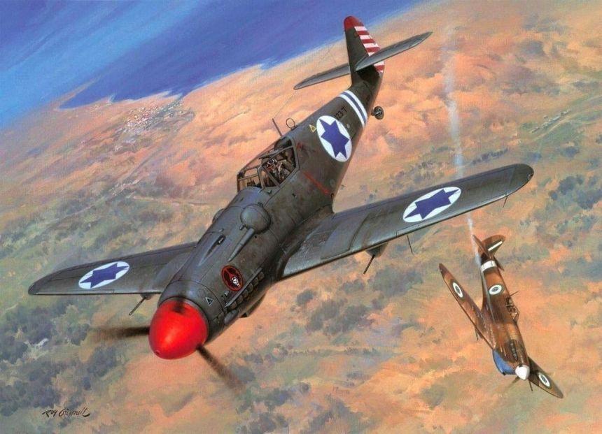 “Strange Encounter” Israeli Messerschmitt Me-109 (Avia S-199) fighter piloted by the American ace Rudy Augarten vs an Egyptian Spitfire, Oct 1948, painted by Roy Grinnell (1995) https://www.roygrinnellart.com/workszoom/3108707/strange-encounter#/