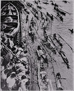 Native outrigger canoes meet up with a Coast Guard transport.