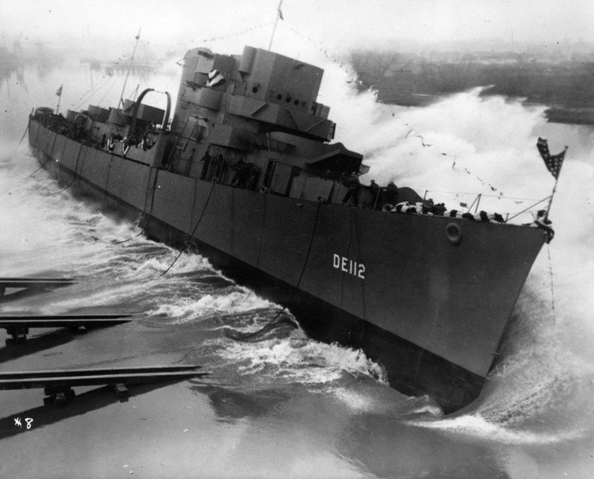 Here we see the future Cannon/Bostwick-class destroyer escort USS Carter (DE 112)launching at the Dravo Corporation yard in Wilmington, Delaware, 29 February 1944.