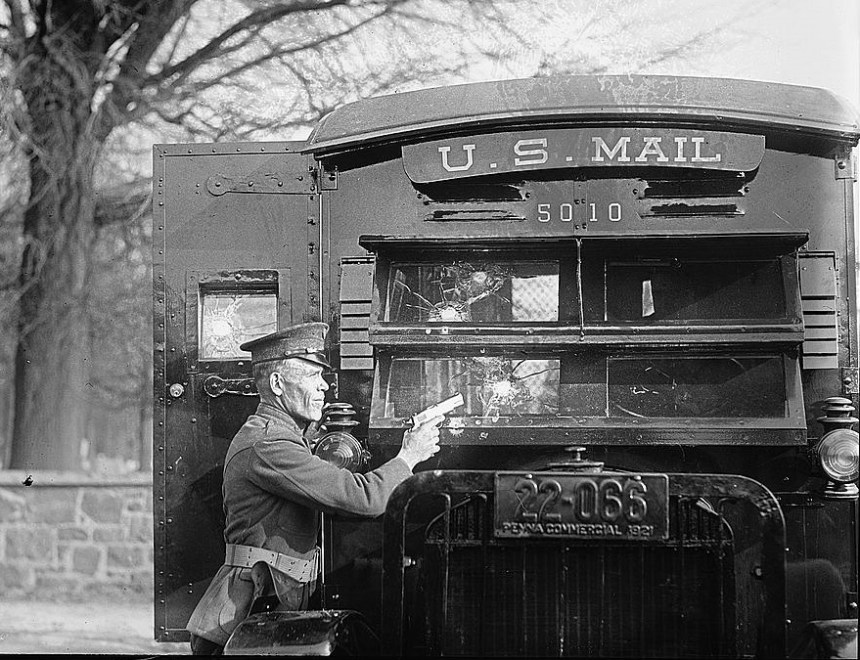“Regulation Army .45 Colt and its effect on bulletproof glass used in the new armored postal trucks which it is proposed to put into use as a further protection of valuable mails,” December 1, 1921.