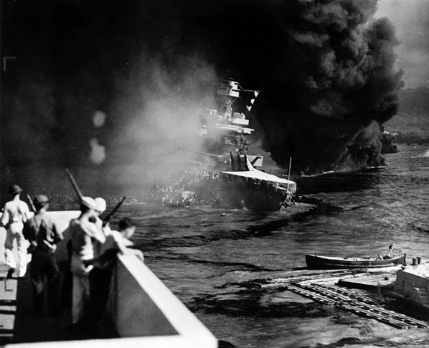 The crew abandoning the damaged battleship USS California (BB-44) as burning oil drifts down on the ship, at about 1000 hrs on the morning of 7 December 1941, shortly after the end of the Japanese raid. The capsized hull of the battleship USS Oklahoma (BB-37) is visible at the right. Note the Sailors to the left with rifles. Official U.S. Navy Photograph NH 97399