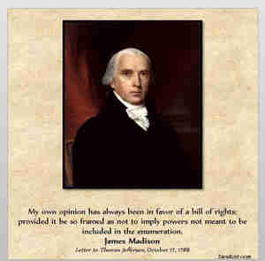 As for James Madison, his position changed over time. At the Constitutional Convention, he seemed unconcerned when a bill of rights was not included in the Constitution. Nevertheless, he was wavering after about a year. In October 1788, he told Jefferson that he generally favored a bill of rights—assuming it did not give the national government new powers by implication—but he “never thought” that omission of these amendments was “a material defect” in the Constitution. Instead, he viewed a bill of rights as a mere “parchment barrier.”