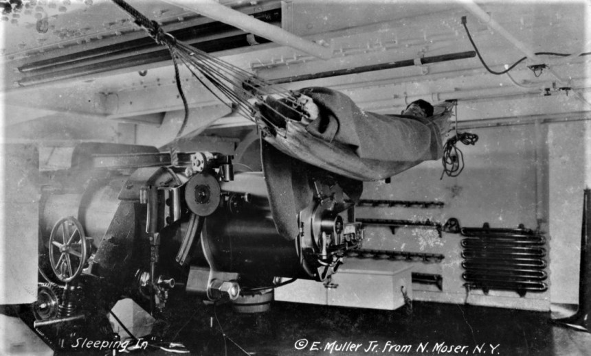 “Sleeping In.” A Sailor occupies his hammock in the broadside gun casemate of a large U.S. Navy warship, circa the mid-1910s. The original image, copyrighted by E. Muller Jr., from N. Moser, New York, is printed on postcard (AZO) stock. Donation of Charles R. Haberlein Jr., 2008. U.S. Naval History and Heritage Command Photograph. Catalog #: NH 106268