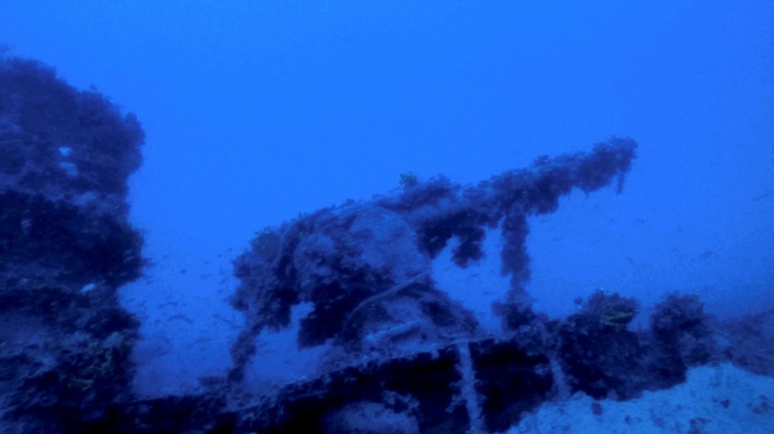 The view of the deck gun of the Italian submarine Jantina that was sunk during World War II by the British submarine HMS Torbay, south of the island of Mykonos, in the Aegean Sea, Greece, November 3, 2021. Kostas Thoctarides/Handout via REUTERS