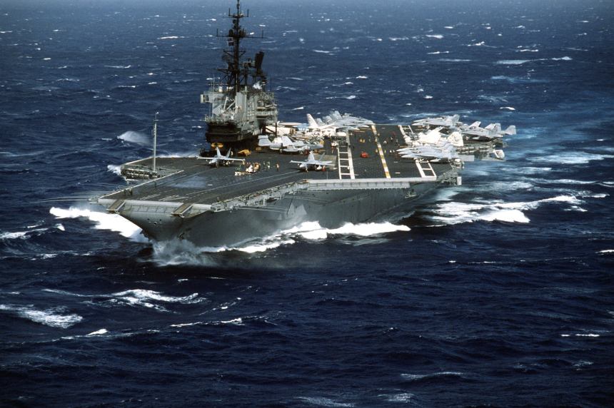 A beautiful port bow view of the aircraft carrierUSS Midway (CV-41, ex-CVB/CVA-41)“somewhere in the Philipine Sea” as she is underway with Carrier Air Wing 5 (CARAIRWING FIVE) embarked, early January 1987.