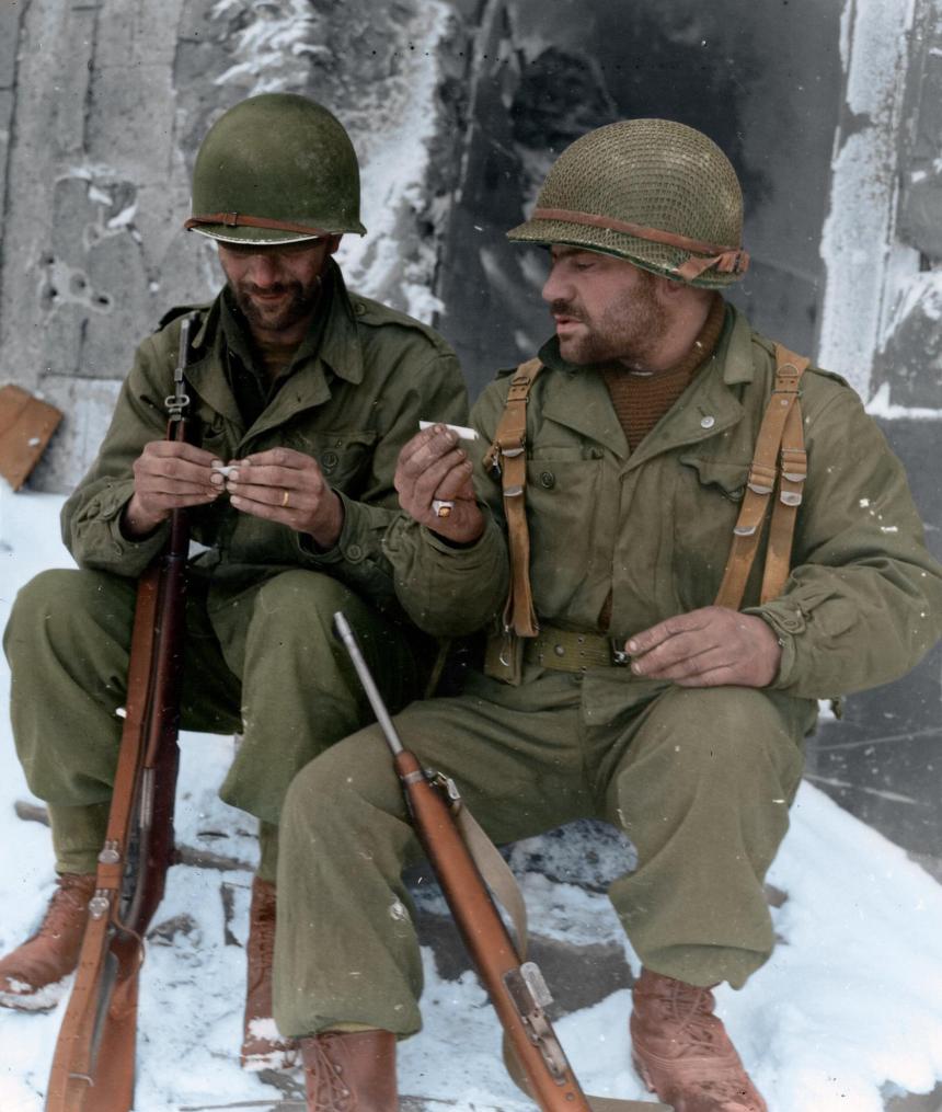 77 Years Ago Today: Two riflemen from E Company, 1st Battalion, 317th Infantry Regiment, 80th Infantry Division, take a moment to roll their own cigarettes in Goesdorf (Luxembourg), 10 January 1945. Left is SSG Abraham Aranoff, Boston, Mass., right is Private Henry W. Beyer of Grand Rapids, Michigan. These men had been fighting for 27 days straight, most of it during the German counter-offensive in the Ardennes known today as the Battle of the Bulge. They’d just been pulled out of the lines for a short, well-deserved break.