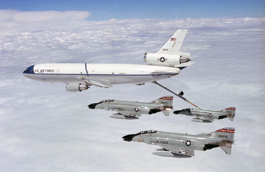 U.S. Air Force F-4D Phantom II aircraft assigned to the 119th Fighter Wing “Happy Hooligans”, North Dakota Air National Guard, conduct mid-air refueling from a U.S. Air Force KC-10A Extender aircraft. (A3604) (U.S. Air Force…