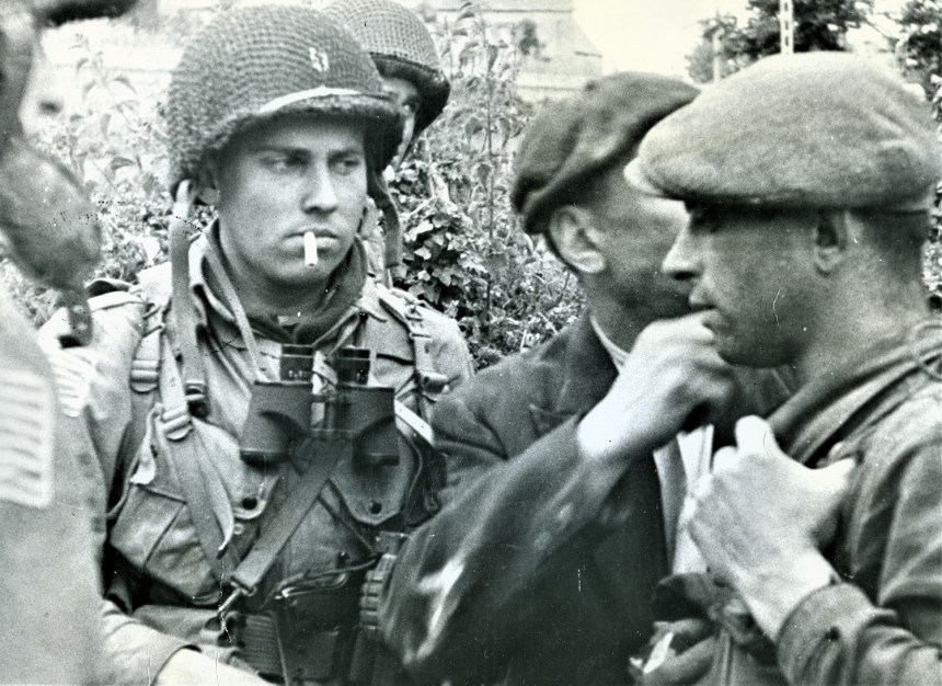 I’m not sure which unit the above Camel-smoking junior officer is from, but the same photo is identified in other records as “Capt. Kenneth L. Johnson and paratroopers of HHC S-2 Intelligence Section, 508th PIR, 82nd Airborne Division ‘All Americans,’ talking with two Francs-tireurs partisans in the village of Saint Marcouf, Normandy, France. D-Day, 6 June 1944.” The Frenchman certainly looks to have a slung rifle or shotgun over his shoulder, something the Captain would surely be interested in.