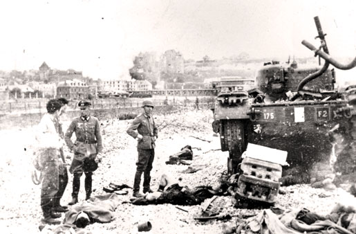 German officer and soldiers examining a Churchill tank stuck on the beach in front of the boardwalk after the battle, its left track broken. Wounded men lying on the ground are about to be evacuated. Dieppe, August 19th, 1942. Department of National Defence / National Archives of Canada C-017293.