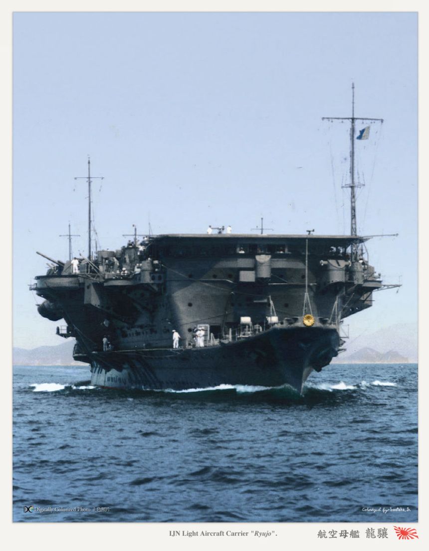 Above we see the Japanese light carrier Ryujo(also sometimes seen in the West incorrectly as Ryukyu) on sea trials at Satamisaki-oki, 6 September 1934 after her reconstruction, note her open bow and tall flight deck, showing off her bridge under the lip of the flattop. Built to a problematic design, she had lots of teething problems and, while she breathed fire in the Empire’s dramatic expansion after Pearl Harbor, the sea closed over her some 80 years ago today and extinguished…