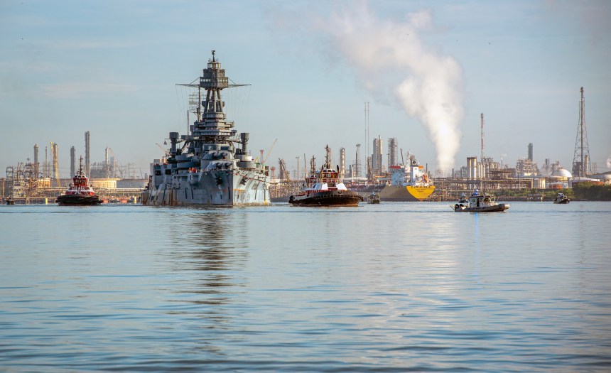 Early Wednesday morning, USS Texas (Battleship No. 35) was pulled out of her traditional berth into the Houston Ship Channel and was guided by the tugs Cecile M, Wesley A, Dolphin, and Audrey while the 87-foot patrol boat USCGC Hawk (WPB-87355) stood guard. She completed her stately 10-hour transit at 15:57– America’s oldest (and only) sea-going battleship!