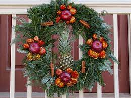 Christmas celebrations have been around for centuries. In the 18thcentury American Colonies, particularly in the South, people decorated their houses with home made wreaths of pine boughs and cones, ribbons and vegetation. It was usually more “green” than “red.” And the “red” was usually a darker red. The red of apples and pomegranates and berries.
