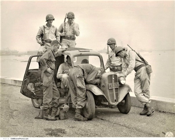 11th Airborne troopers attempting to fix a coal-burning vehicle.