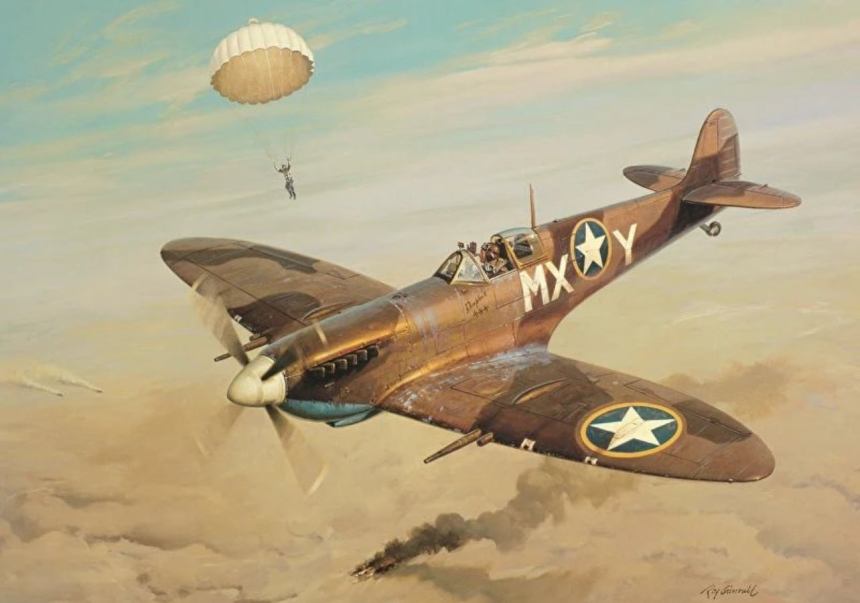 80 Years Ago Today: The 6th of May, 1943, near Tunis, Algeria. 1st. Lt. Jerry Collinsworth, USAAF, thumbs his nose at the pilot of a German Luftwaffe Fw190 he just shot down. This was the fourth of six victories scored by Collinsworth, all were Fw190s, all achieved in his Spitfire.