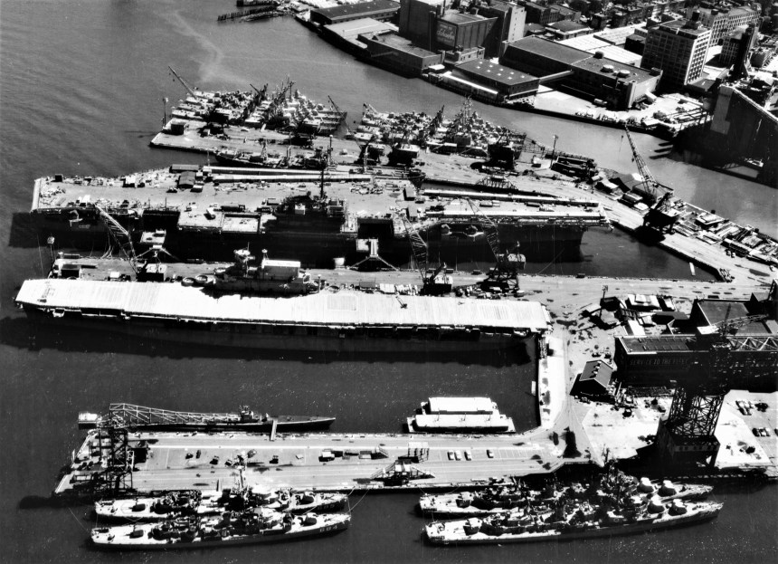 The new Forrestal-class supercarrier USS Independence (CVA-62), almost twice as large by displacement, is fitting out on the opposite side of the pier. Ships visible in the left foreground include (from the front): the destroyer escorts USS DeLong (DE-684), USS Coates (DE-685), and the diesel fleet boat USS Hoe (SS-258). Ten other destroyers are also present, as is a Liberty-type ship. The Schaefer Brewery is visible in the center background.