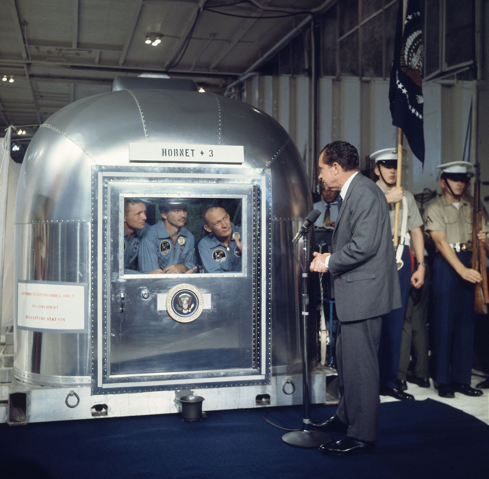 On July 24, 1969, Apollo 11 re-entered Earth’s atmosphere, with the Command Module safely splashing down in the Pacific Ocean. The crew was swiftly retrieved by the USS Hornet aircraft carrier, where they underwent medical evaluations and were placed in quarantine to prevent any potential lunar pathogens from affecting Earth’s ecosystem.