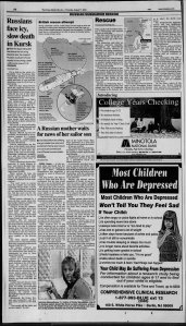 The explosions devastated the forward section of the submarine, killing most of the crew instantly. The Kursk sank to a depth of about 108 meters (354 feet).