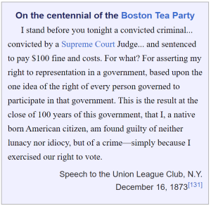The act of defiance did not go unnoticed. Within days, Anthony was arrested for “illegally voting”. The charges were based on a section of the Fourteenth Amendment stating that voting rights were granted to “citizens” of the United States, but it was widely interpreted at the time to mean only male citizens.