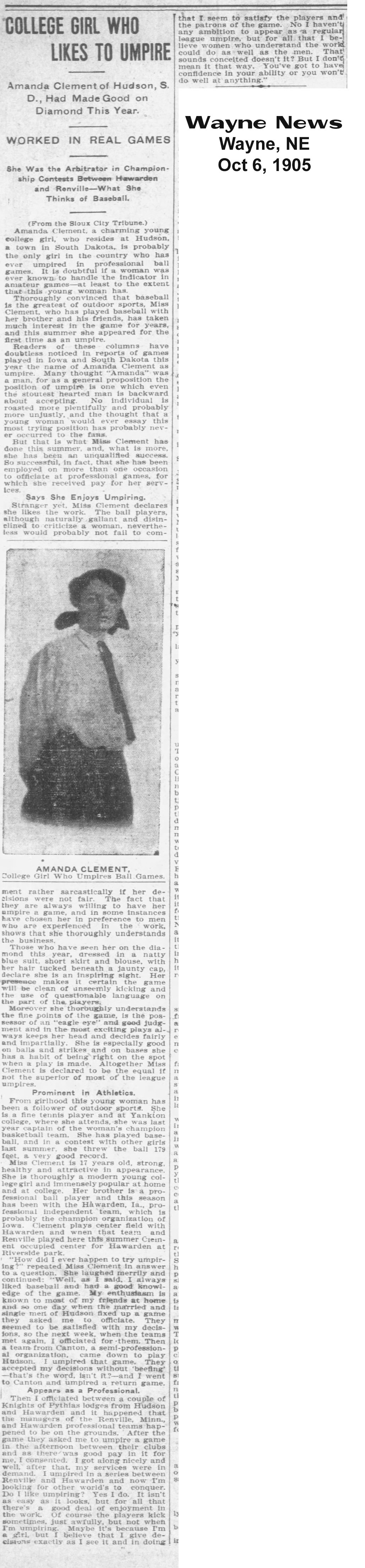 Clement’s career as an umpire helped finance her education. She attended Yankton College and later the University of Nebraska, earning a degree in physical education. While in college, she continued to break barriers, playing basketball, running track, and setting a national record for women in the baseball throw. She also refereed high school basketball games, leading some to speculate that she was the first woman to officiate that sport as well.