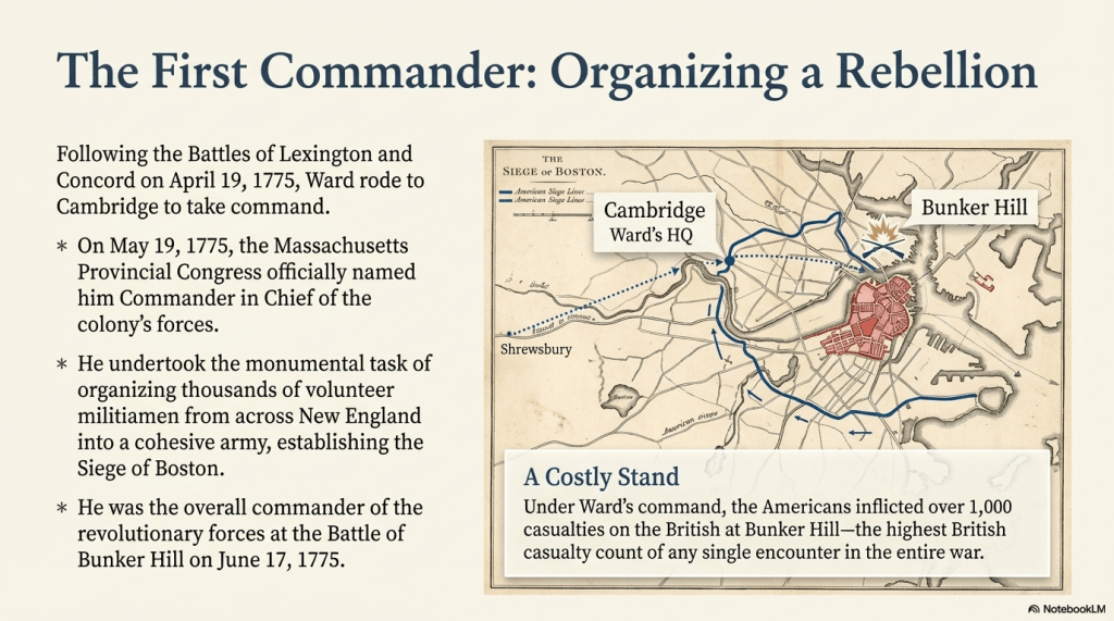 By 1774 the air around Boston crackled with tension. Ward pushed the Provincial Congress to secure arms and supplies, understanding that conflict was no longer an if but a when. On October 27, 1774, the Congress appointed him a brigadier general. He did not have to wait long to take the field. The shooting at Lexington and Concord on April 19, 1775, turned everything from protest into open war. When Ward heard the news, he mounted his horse and rode to Cambridge, arriving on April 20 to take command of the provincial militia that had converged on Boston.