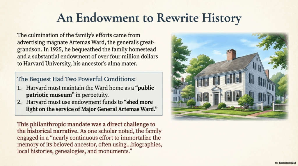 The last major revival came from his great grandson, also named Artemas Ward. This Ward was an advertising magnate with a keen sense of how memory could be shaped and sold. In 1921 he commissioned a biography to argue that the general should be remembered as the first Commander in Chief of the American Revolution. It was a bold move. Some embraced the idea. Others scoffed. But the argument gained traction.